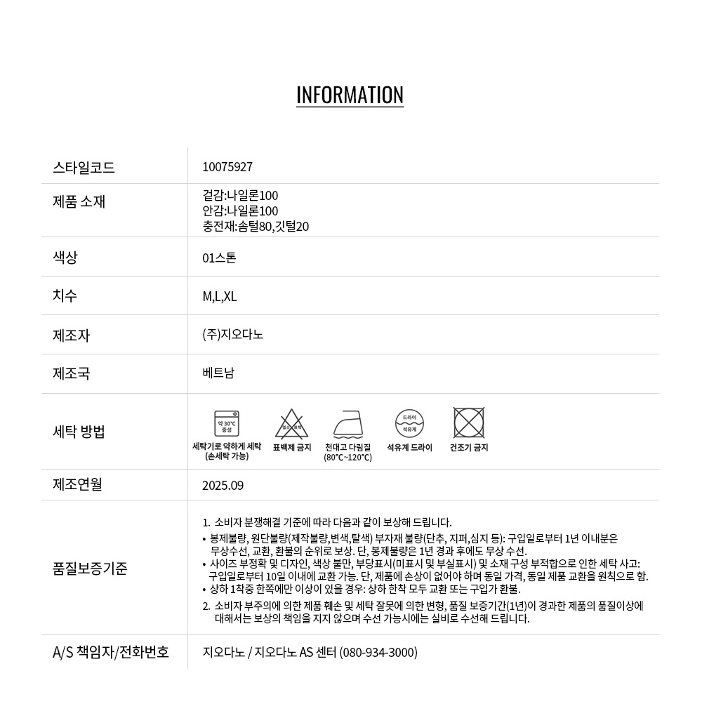 나일론 100% 원단을 사용했으며, 내구성이 탄탄하면서도 광택이 느껴지는 터치감을 구현했습니다. 겨울 시즌에 최적화된 보온성과 내구성을 제공하며, 충전재로는 덕다운 90/10을 사용하여 가볍지만 뛰어난 단열 효과를 선사합니다. 계절감과 활용성을 모두 갖춘 고기능성 소재가 특징입니다.