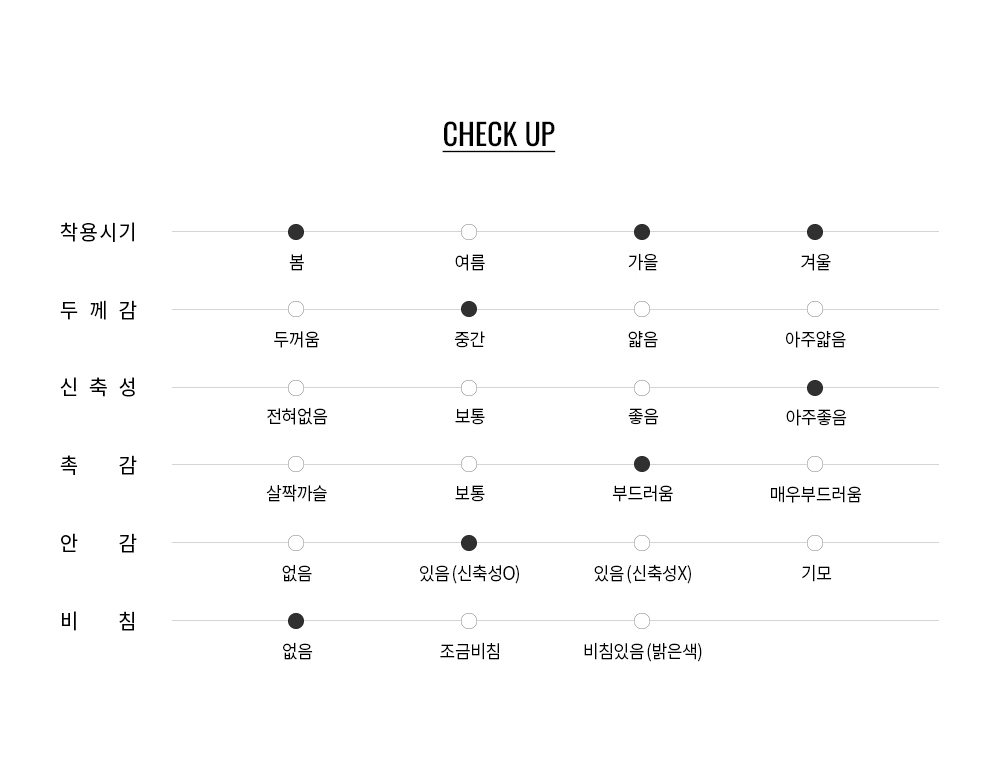 폴리에스터와 비스코스, 스판 혼방 소재로 제작되어 가벼운 터치감과 쾌적한 착용감을 제공합니다. 신축성이 더해져 활동 시에도 편안함을 유지하며, 사계절 중 특히 간절기 시즌에 적합한 두께감으로 데일리 활용도가 높습니다.