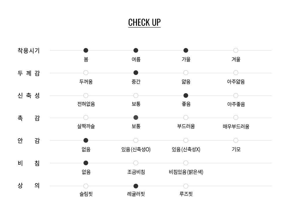 바디를 따라 자연스럽게 떨어지는 레귤러 핏으로 단정하면서도 여유 있는 실루엣을 연출합니다. 과하지 않은 볼륨감으로 다양한 하의와 밸런스 있게 매칭됩니다.