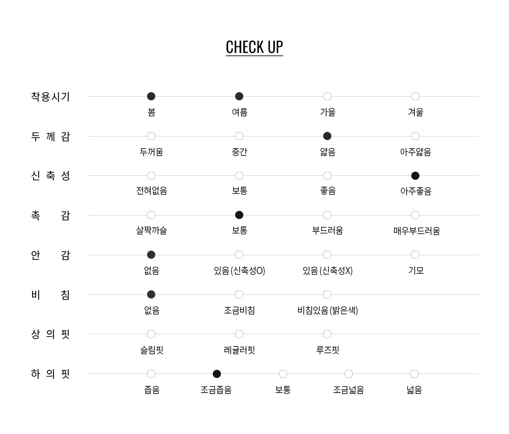 160G/SQM 중량의 T/R 혼방에 PU가 함유된 원단으로, 가벼우면서도 적절한 탄성과 복원력을 제공합니다. 내구성과 착용감이 균형 잡힌 소재로 주름 발생을 최소화하며, 장시간 착용에도 형태 안정성이 우수합니다.