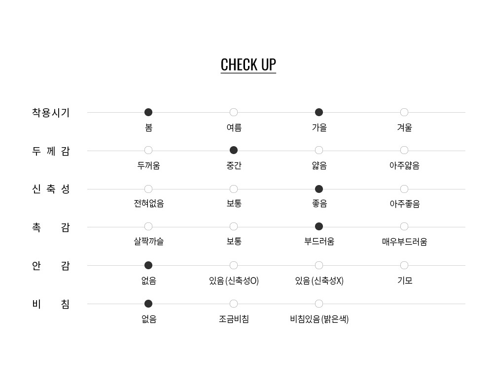 넥 라인과 소매단, 밑단 끝에 립 조직으로 포인트를 주었으며, 스판사를 넣어