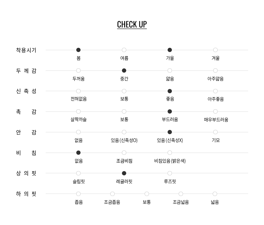 폴리에스터 67%, 비스코스 29%, 폴리우레탄 4% 혼방원단으로, 비스코스 특유의 부드러운 터치감과 자연스러운 드레이프성, 폴리에스터의 형태 안정성, 폴리우레탄의 우수한 신축성이 균형 있게 결합된 것이 특징입니다.