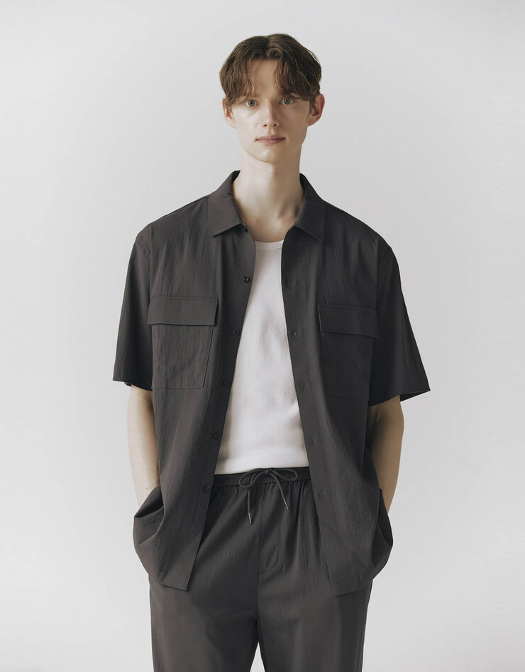 드레이프한 실루엣이 돋보이는 레이온 소재의 유틸리티 반팔 셔츠입니다.